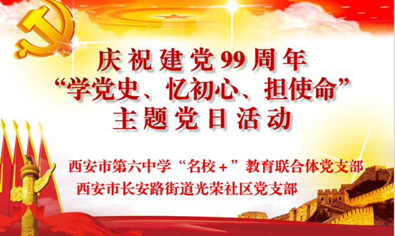碑林融媒讯 为了进一步深入学习贯彻习近平新时代中国特色社会主义思想和习近平总书记来陕考察重要讲话精神,推进“两学一做”学习教育常态化制度化,建立不忘初心、牢记使命的制度,7月1日下午,光荣社区党支部与西安市第六中学党支部联合开展庆祝建党99周年“学党史、忆初心、担使命”主题党日活动。